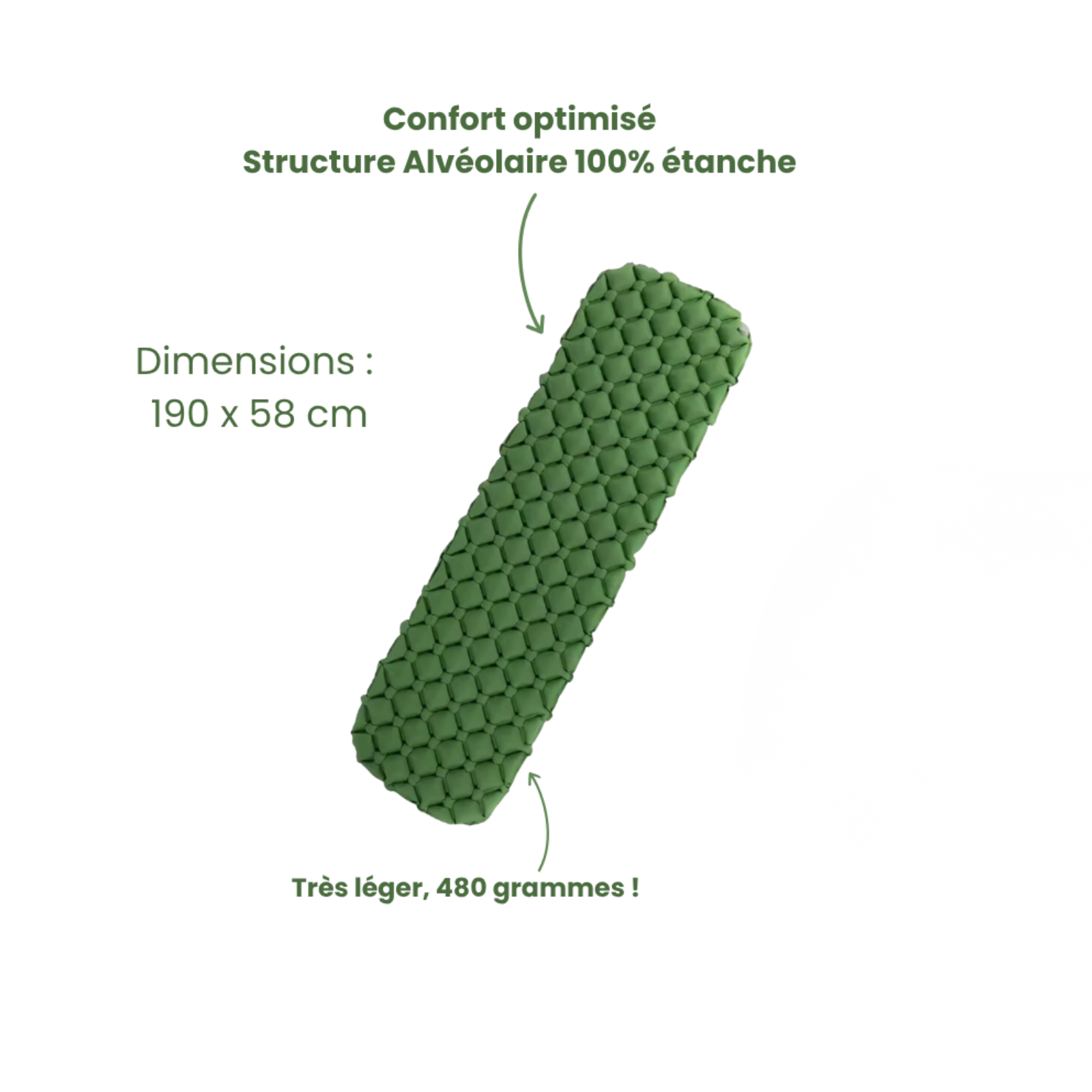 Un résumé clair des bénéfices clés : confort, légèreté et praticité pour vos nuits en extérieur.