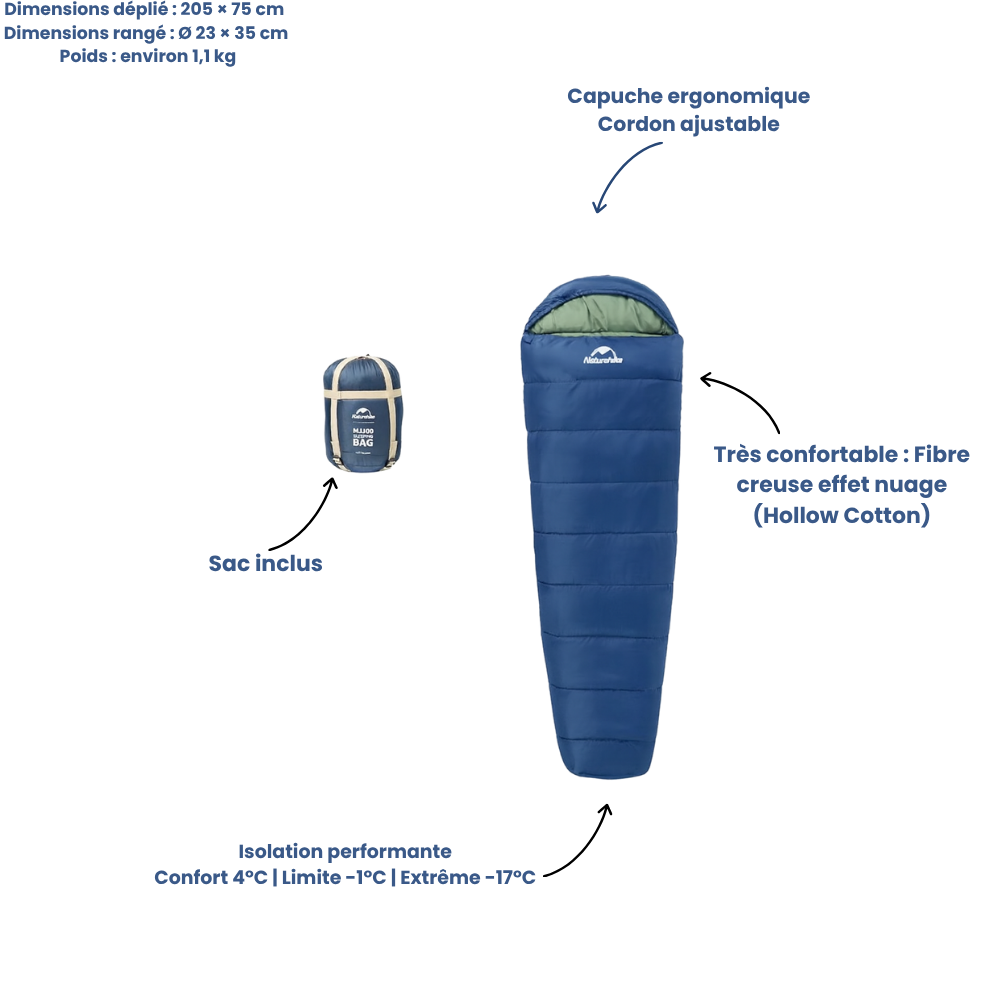 Forme momie avec capuche ajustable pour limiter les pertes de chaleur et optimiser l’isolation.